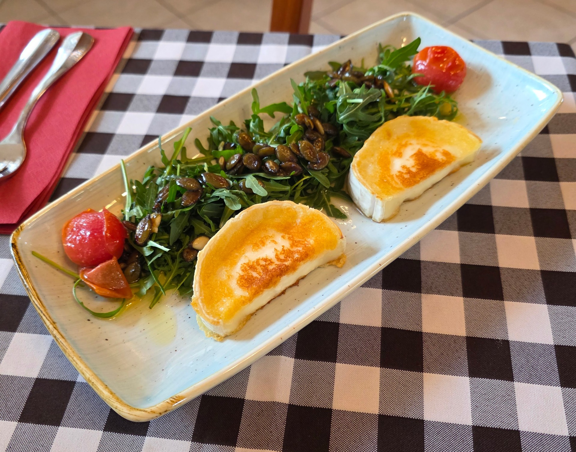 Rukkola, mézes- tökmagos dresszing, grillezett kecskesajt