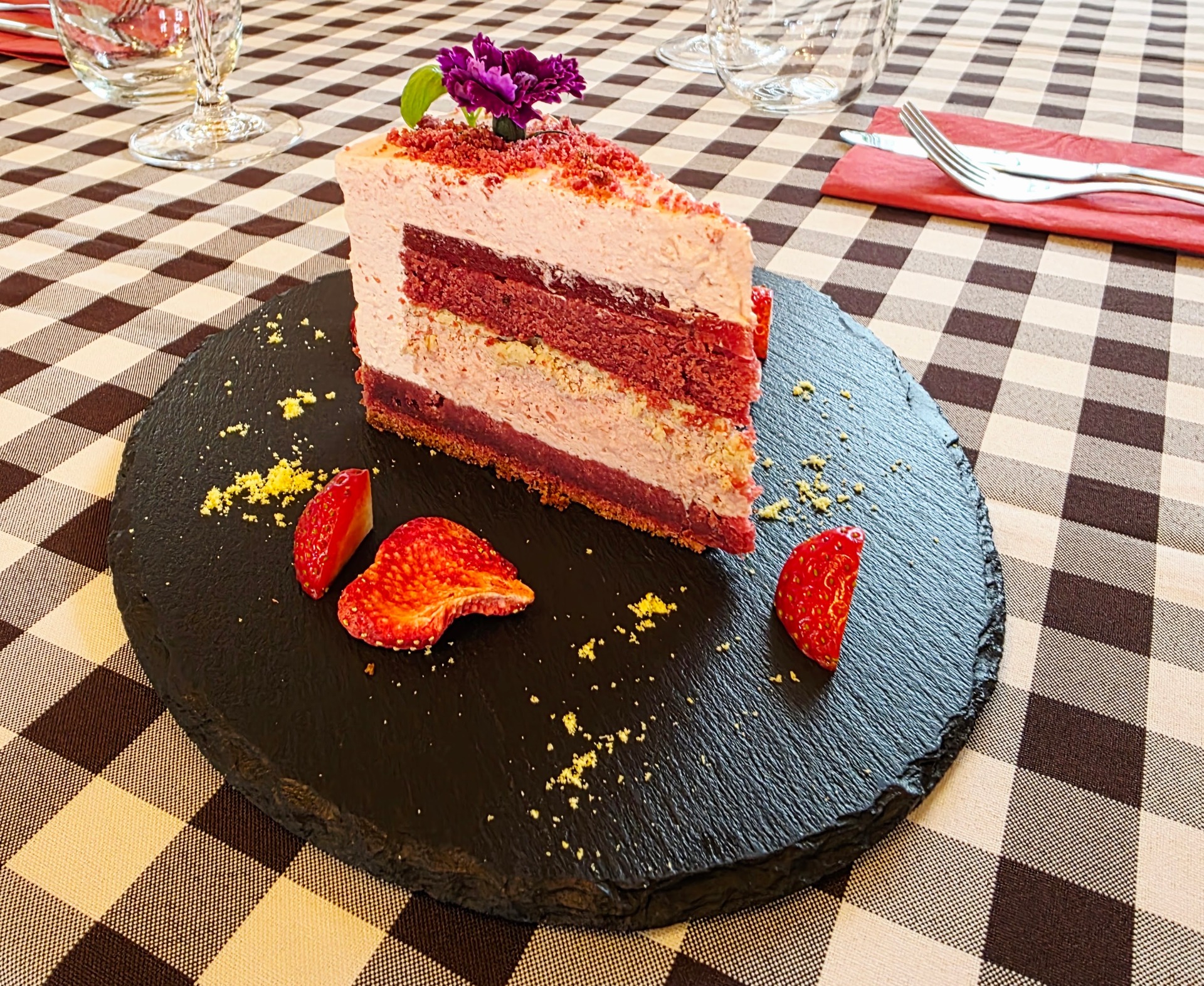 Vörös bársony piskóta, bazsalikomos eperzselé, joghurtos eper mousse